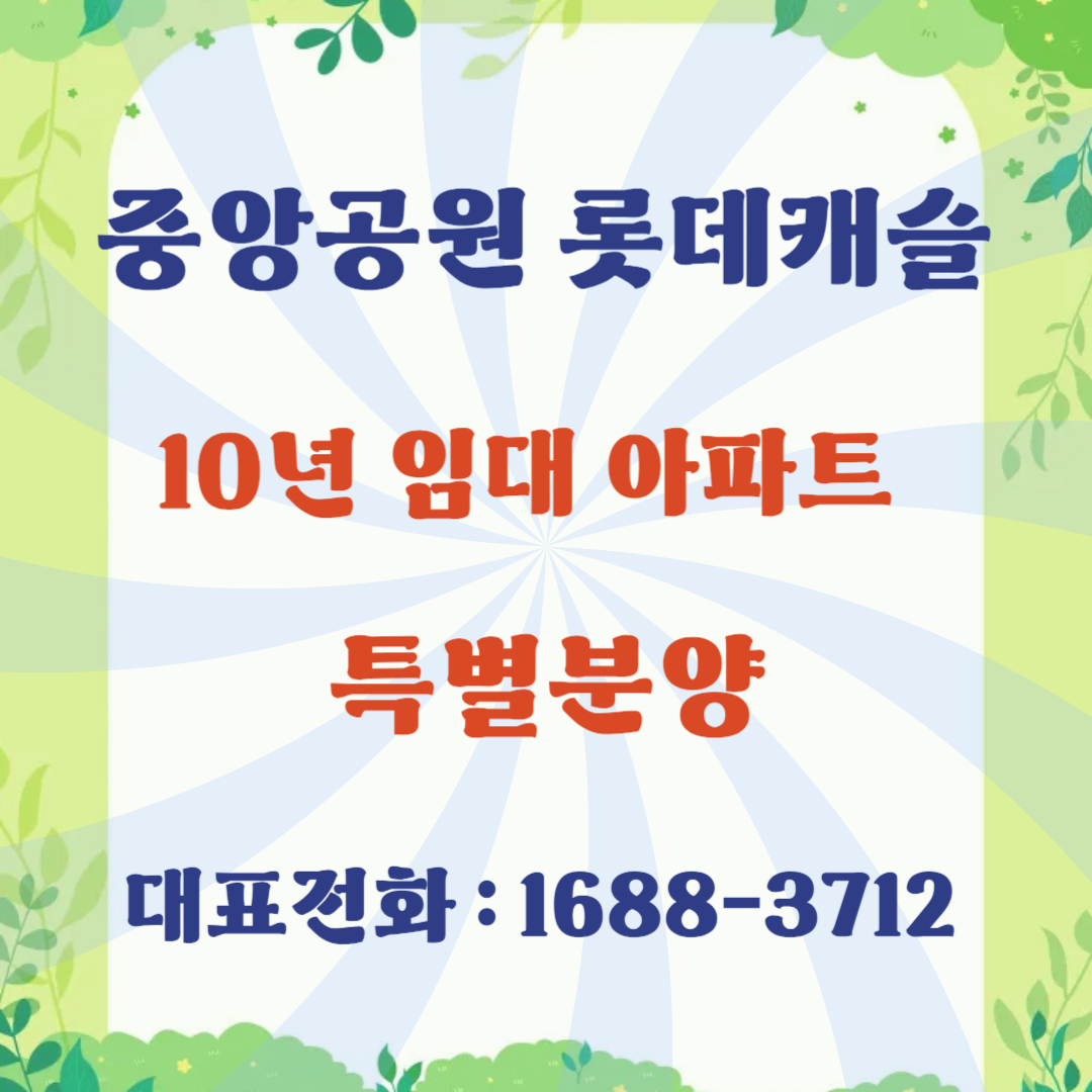 중앙공원 롯데캐슬 10년 임대 특별분양은 중앙공원 근처에 위치한 롯데캐슬 아파트로 입주자가 10년 장기 임대로 안정적적인 주거를 한후 10년후 계약시 지정한 확정 분양가로 우선 분양기회를 주는데 분양 여부는 임차인의 자유 의사에 따라 선택 최소의 비용으로 내집을 마련할수 있는 장점이 많은 중앙공원 롯데캐슬 시그니처의 하이엔드 아파트로 분양 전환의 옵션을 통해 거주 안정성을 높인다는 점에서 많은 관심을 받고 있습니다.